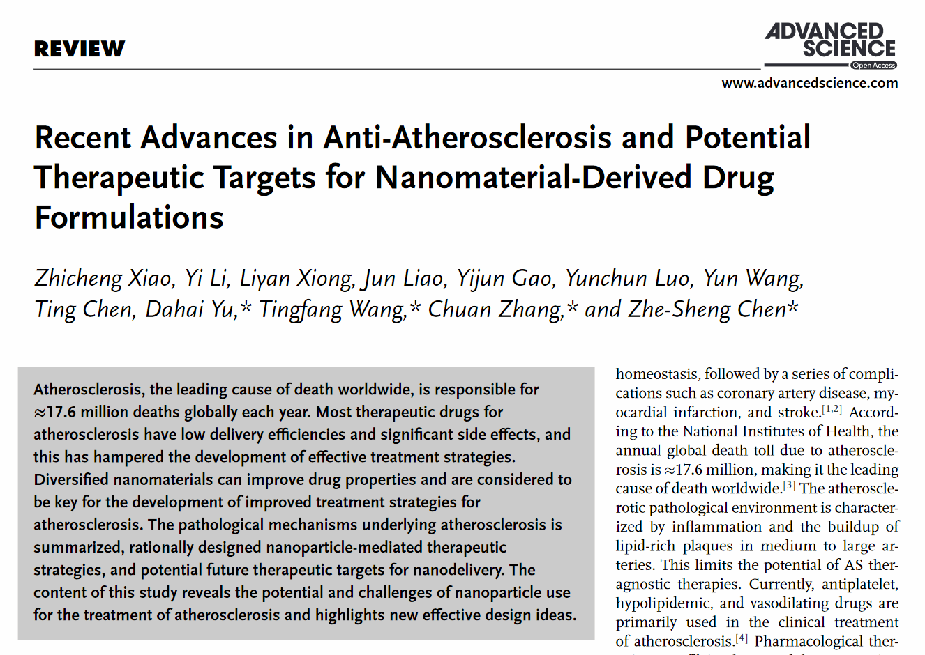 张川教授团队在综合期刊Advanced Science(中科院一区TOP期刊,IF 15.1)上发表了题为“Recent Advances in Anti-Atherosclerosis and Potential Therapeutic Targets for Nanomaterial-Derived Drug Formulations”的研究综述论文。