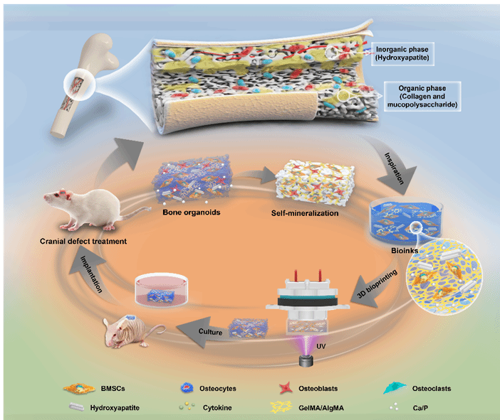 基于目前临床上大型骨缺损修复的挑战,由于临界骨缺损骨自愈能力的限制,导致恢复时间延长和再生效果不理想。现有的解决方案,如金属植入物、同种异体移植和人工移植存在一些显著的缺陷,例如供体部位的限制、疾病传播的风险和次优的骨整合。高活性功能化骨类器官的构建为解决这一临床难题提供了新策略。骨类器官是基于生物活性材料构建并从干细胞或祖细胞定向分化而来的具有仿生空间特征的三维自我更新和自组织的微骨组织,它们在功能上与原生组织相似,为骨组织工程提供了新的解决方案。然而,由于骨类器官的构建的特殊性,一方面需要大尺寸的空间结构来满足硬骨组织的轮廓结构,另一方面需要有良好的力学性能来完成骨的运动支撑功能。骨类器官的发展一直面临着挑战。目前现阶段的骨类器官的构建存在小尺寸,与自然骨组织相比细胞外基质成分差异大,细胞单一,缺乏空间特征化,结构上没有达到骨的微观结构等问题。聚焦这些关键问题,研究人员通过设计全新的适用骨组织工程的生物墨水,利用数字光处理生物打印技术,精确复制骨组织复杂微观结构,然后在体内外长时间的定向培育,使之分化成含有多种骨髓细胞(血细胞、免疫细胞、血管内皮细胞、软骨细胞、成骨细胞,脂肪细胞和破骨细胞),力学性能良好(杨氏模量MPa级,接近于松质骨),空间拓扑结构类骨(疏松多孔的微纳结构)和大尺寸(厘米级)的功能性骨类器官。并将其应用于骨缺损模型的再生修复,显示出强大的修复能力。