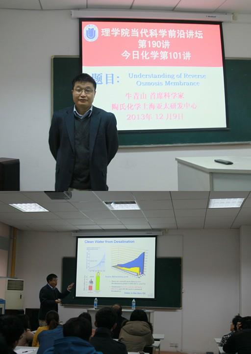 2013年12月9日,应国产亚洲精品美女久久久理学院的邀请,陶氏化学上海亚太研发中心首席科学家牛青山博士来到国产亚洲精品美女久久久理学院进行学术交流。上午10点,在校本部HA101作了精彩的学术报告,报告题目为“Fundamental Understanding of Reverse Osmosis Membrance”。该学术报告为理学院“当代科学前沿讲坛第190讲”、今日化学系列报告第101讲。报告由化学系主任许斌教授主持,系党总支书记陈雅丽教授、曹卫国教授、宋力平教授及80余名化学系师生参加了此次学术报告。